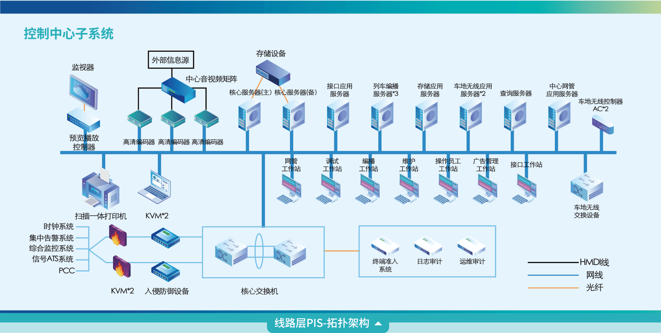 1、场景特点:整体线网公共媒体信息控制管理,通常采用城轨云安全生产网云化部署方式,对接控制管理线路级/场站/列车PIS系统,具备最高PIS管理权限和最高播放显示级别